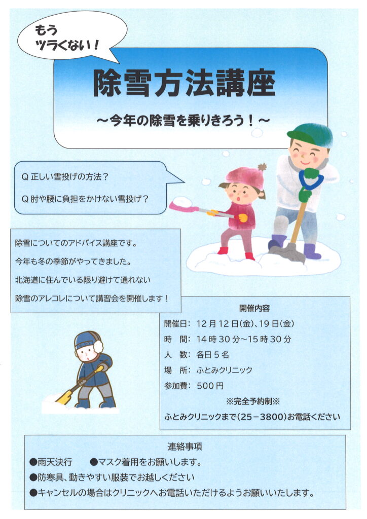 除雪講座のお知らせ 2025 11/14 12月にふとみクリニック内にて、除雪のための講座を開催いたします。 お申し込みはお電話・窓口にて承ります。 これから始まる除雪シーズン、リハビリスタッフによる体に負担をかけない除雪の方法を伝授します! ご興味のある方はぜひご参加ください お知らせ